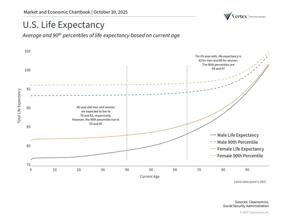 According to the latest Social Security Administration data, 40-year-old men and women have an average life expectancy of 79 and 83, respectively. However, for those who make it to 65 years of age, their life expectancies increase to 83 and 86. These are just averages – those in the 90th percentile could live to 94 and 97,