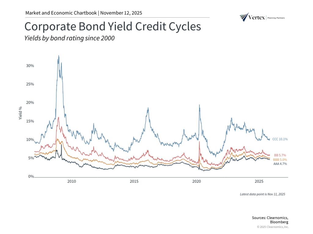 The comment that reflects investor concerns the most is JPMorgan CEO Jamie Dimon’s recent statement that “when you see one cockroach, there are probably more.” While these individual cases are concerning and have led to brief market swings, the question is whether they represent broader problems in credit markets and warrant comparisons to the 2008 financial crisis or the 2023 banking crisis. For long-term investors, understanding this distinction is crucial since managing risks is not about reacting to each headline, but about holding a portfolio that can perform well through periods of uncertainty.