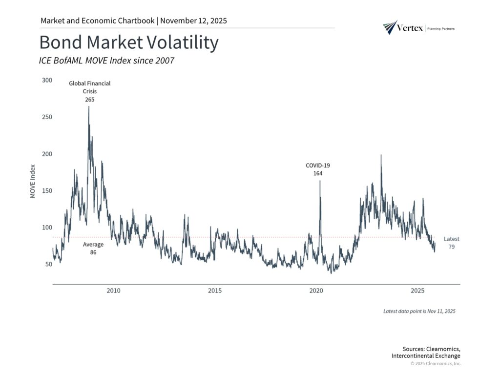 First, the dollar amounts involved, while significant for individual institutions, represent a small fraction of the overall financial system. Second, larger banks are generally well-capitalized and diversified across many lending categories, reducing their vulnerability to problems in any single area. Third, unlike past crises, there’s no evidence yet of a broader economic challenge that would cause widespread credit problems. The chart above shows that the banking system has been more stable over the past two years.