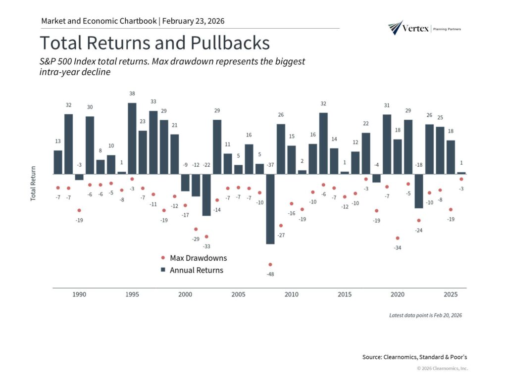 The clearest lesson from the past year of tariff volatility is one that applies to virtually every period of market and policy uncertainty: by far the best thing investors could have done was to stay invested. Trying to predict the precise effect of tariffs on the economy and markets is not only difficult, but counterproductive. As the accompanying chart shows, years with significant intra-year pullbacks have very often still ended with positive returns.