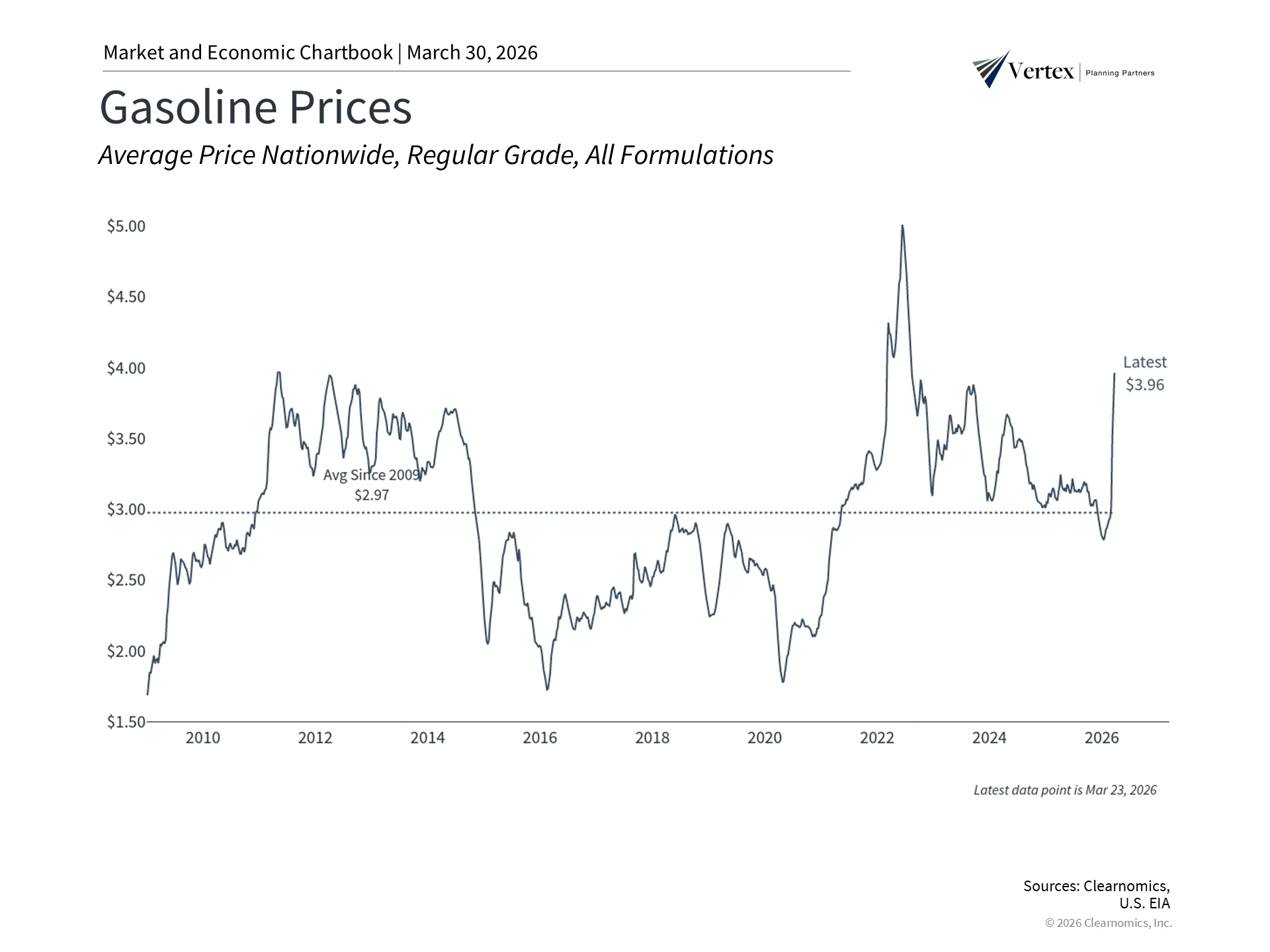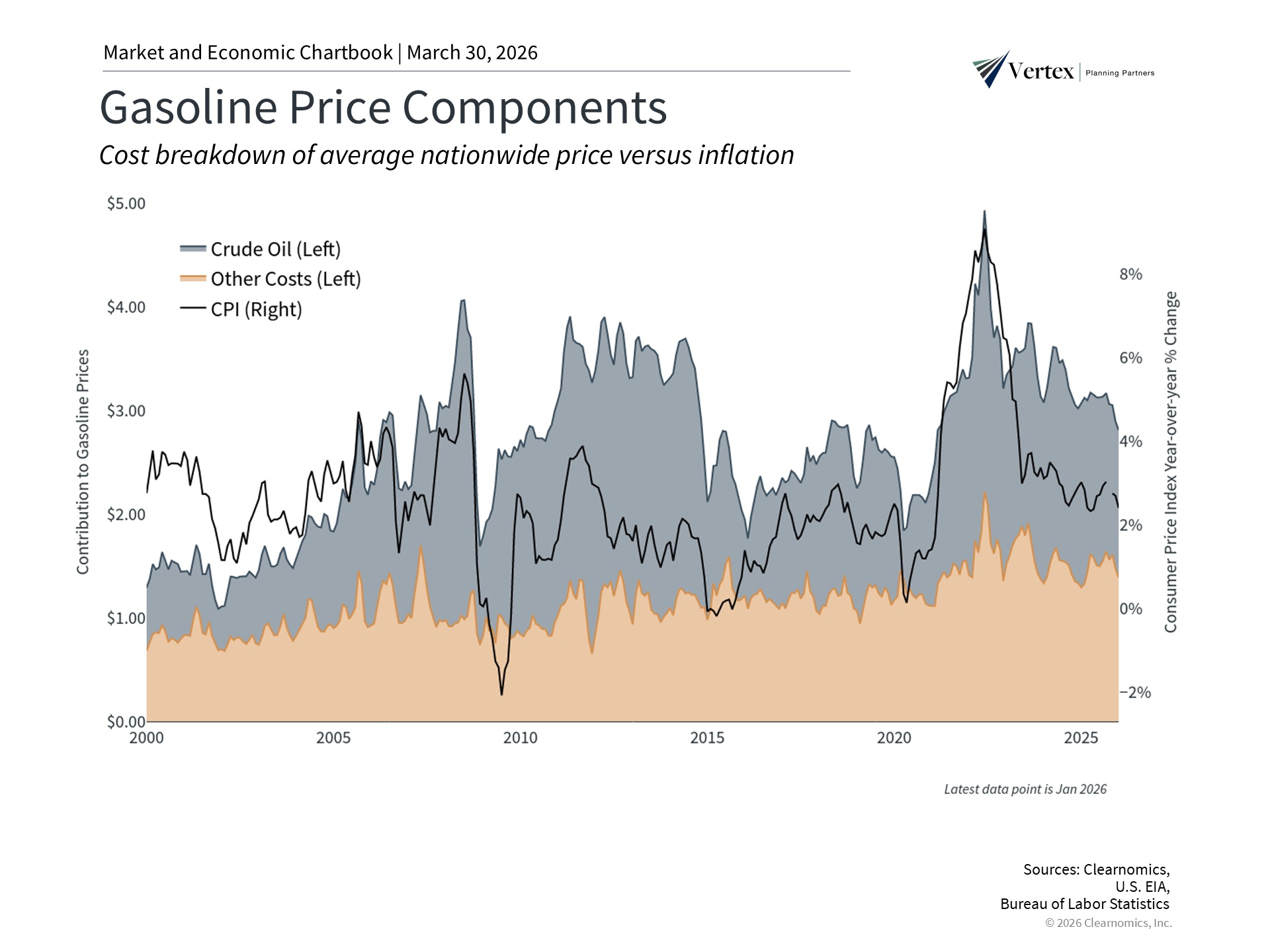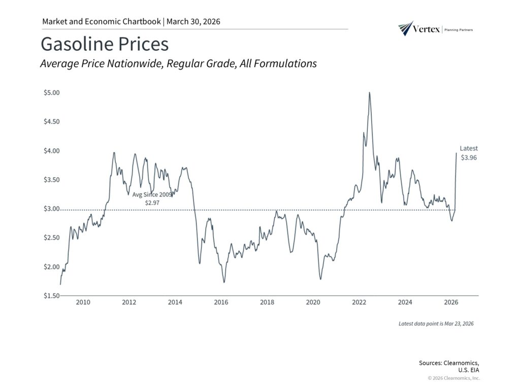 Rising gasoline prices are a burden for consumers and will likely drive headline inflation higher. However, history shows that markets and the economy have navigated past energy shocks. Investors should maintain a long-term perspective, avoid overreacting to daily headlines, and stay focused on their financial plans.